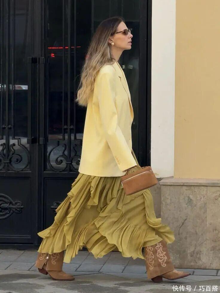 在春天半裙的选择上,大家尽量以简单基础的款式和配色为主,材质到位的情况下,这两大元素也能改善整体观感。