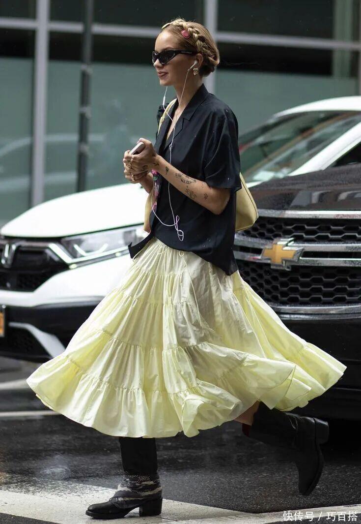 挑选春天半裙时,一定要选择可以迎合春天自由烂漫、洒脱随性氛围的半裙,这种情况下,宽松半裙上身效果远比直接选择修身直筒或包臀或鱼尾裙款式更应景。