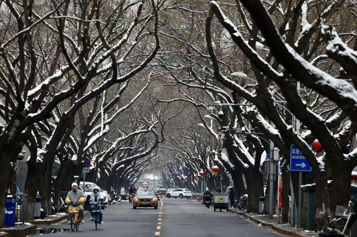 微风拂过,枝头雪沫轻扬,落在青砖路上,为城市勾勒出清隽的轮廓。