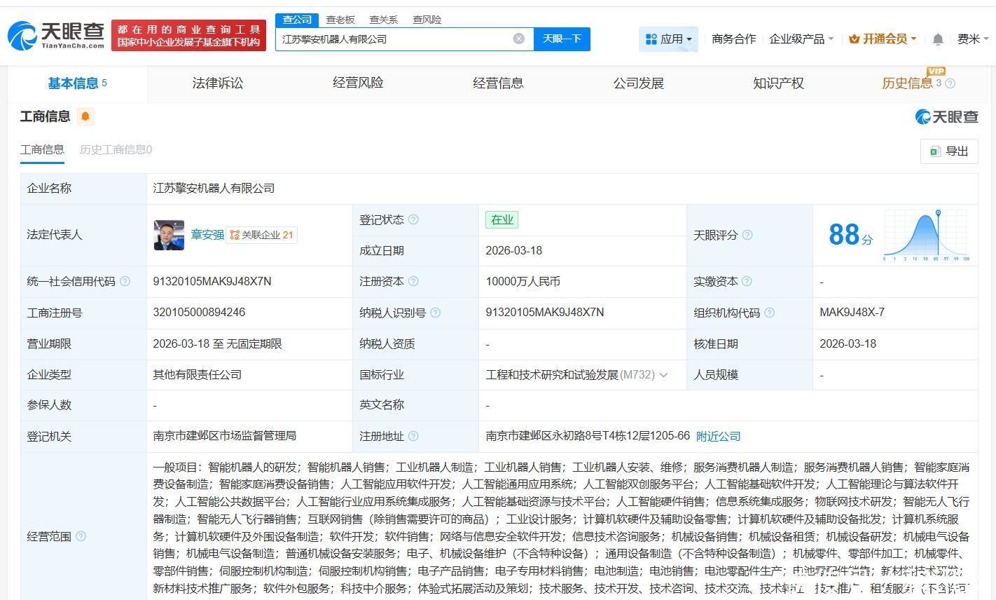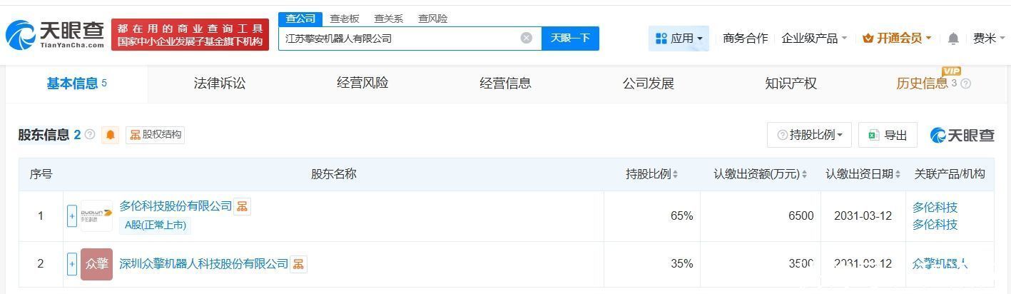 天眼查工商信息显示,近日,江苏擎安机器人有限公司成立,法定代表人为章安强,注册资本1亿人民币,经营范围包括智能机器人的研发、工业机器人制造、服务消费机器人制造、人工智能应用软件开发等。股东信息显示,该公司由多伦科技(603528)、深圳众擎机器人科技股份有限公司共同持股。