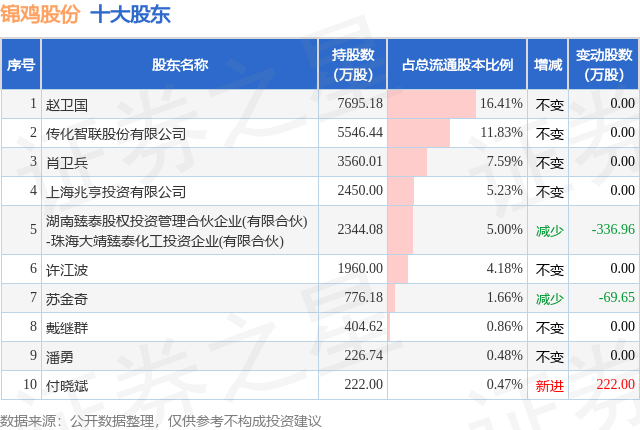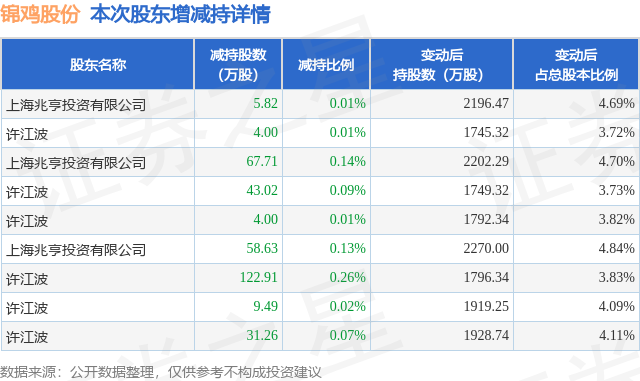 证券之星消息实盘杠杆配资,8月22日锦鸡股份发布公告《锦鸡股份:关于股东减持股份计划到期暨减持股份进展的公告》,其股东上海兆亨投资有限公司、许江波于2025年5月28日至2025年6月13日间合计减持346.84万股,占公司目前总股本的0.7398%,变动期间该股股价上涨60.71%,截止6月13日收盘报11.25元。