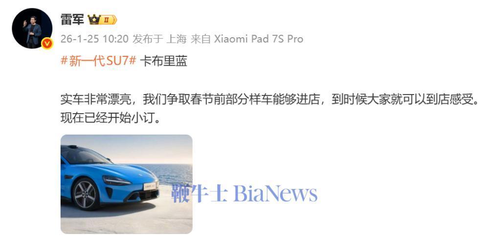 1月7日,小米汽车官宣新一代SU7,预计2026年4月上市。