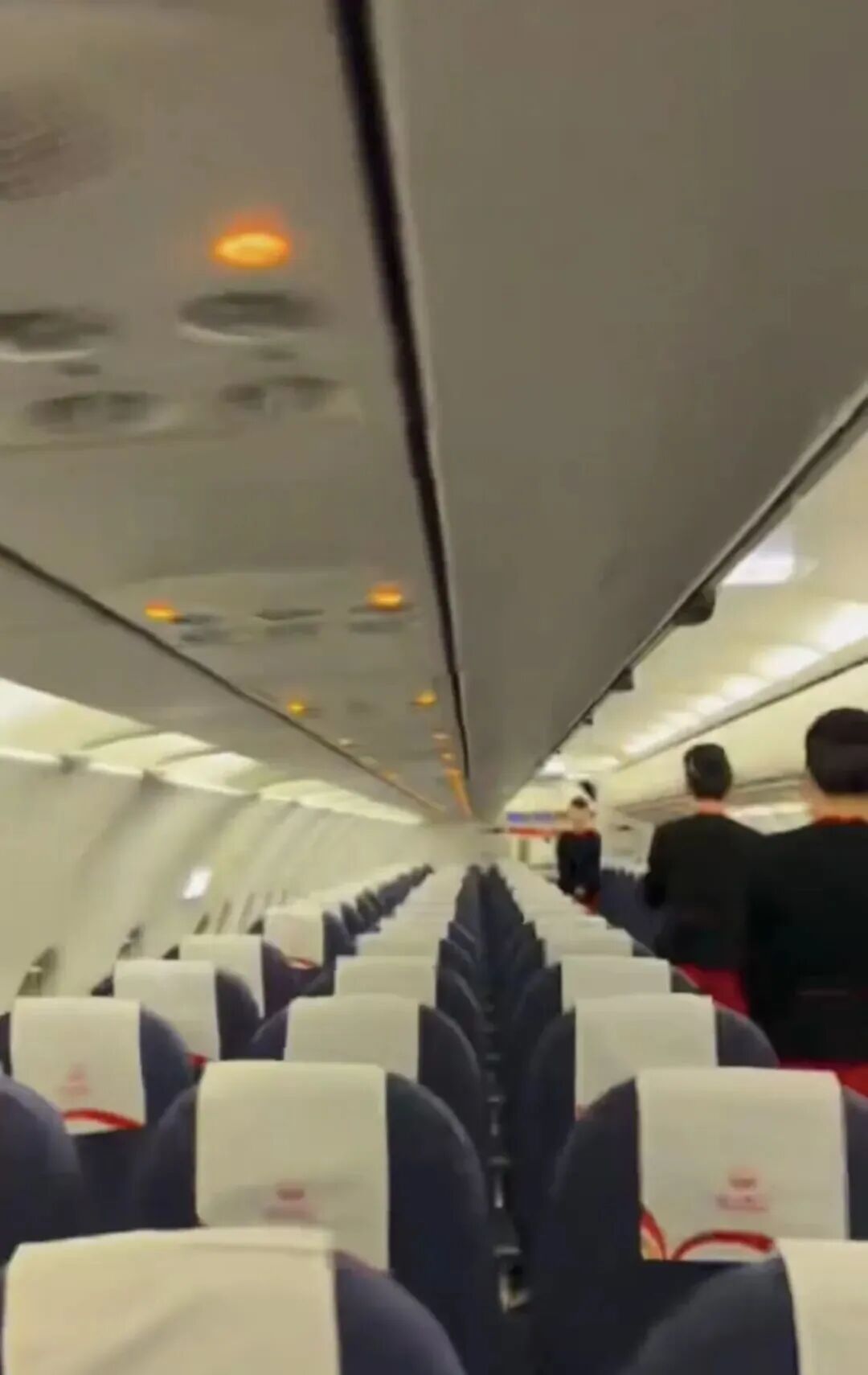 记者从其发布的视频中看到,在一架有川航标识的飞机客舱中,该乘客没有出镜,而是用镜头环顾了整个客舱,座位上空无一人,有身着川航服装的三名空姐,分别站在走道中间的不同区域,正按流程在做乘机提醒。